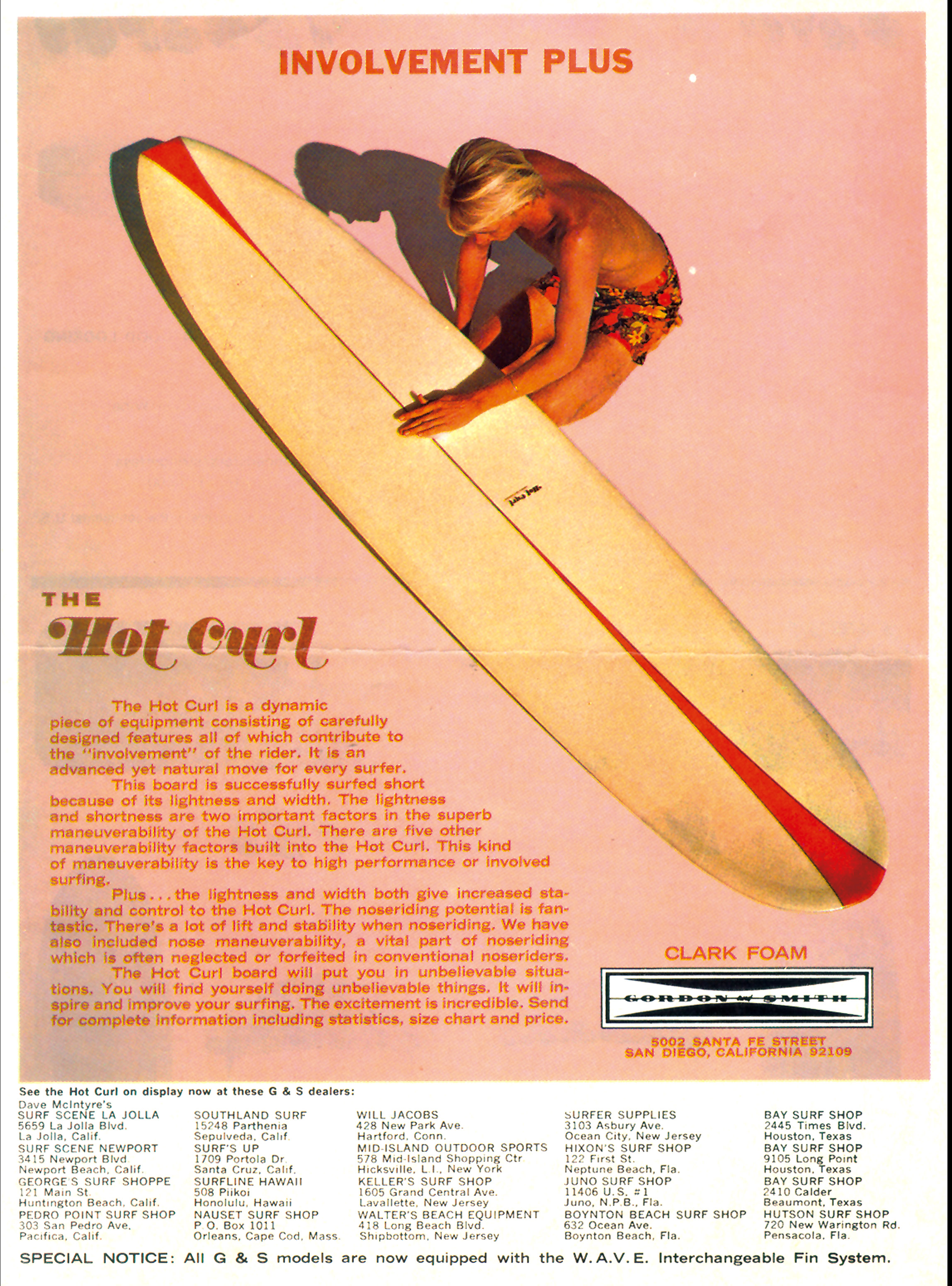 Fast forward a few days, the time it takes for shipping. I see the package on my front porch, so I crack it open and start thumbing through the pages. It’s the history of the brand, their boards, and their shapers. It’s loaded with old pictures and ads and shots of folks enjoying themselves in the waves. There on page 74 is an ad from 1968 for my Hot Curl, and the ad’s headline How Short?